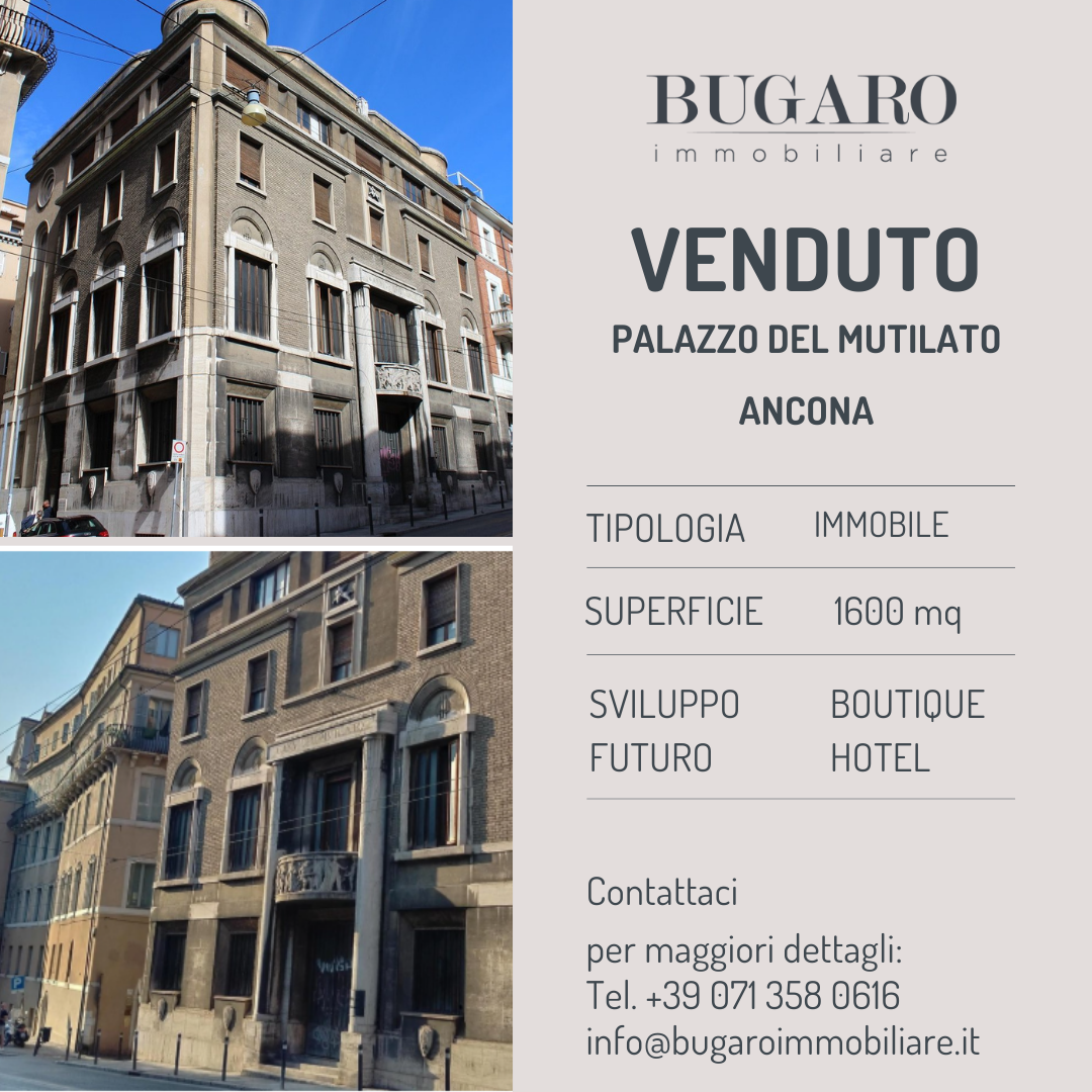 Il Gruppo Cecconi ha acquistato lo storico immobile “Palazzo del Mutilato”, sito nel cuore del centro di Ancona, destinato a divenire il primo boutique hotel a 5 Stelle mai realizzato nel capoluogo. La Bugaro Immobiliare è l’Advisor che ne ha curato la compravendita in ogni sua fase. A breve inizieranno i lavori di ristrutturazione che prevedono, l’accettazione, un ristorante di livello internazionale oltre ad una sala riunioni e convegni, un centro benessere e, ai piani superiori, le camere. L’operazione garantirà alla città una maggiore offerta sotto il profilo ricettivo, con un impatto di sicuro prestigio per tutto il territorio.